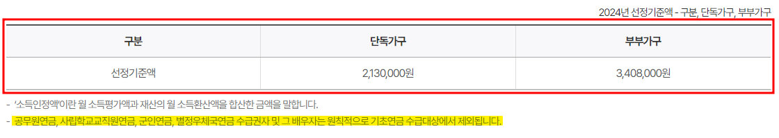 선정기준액은 월 1인 단독가구 213만원 부부가구 340만8000원 이하일 경우 수령 대상이 됩니다. 2024년 올해부터는 고급자동차를 소유한 노인도 소득 조건만 충족되면 기초연금 수령이 가능합니다.